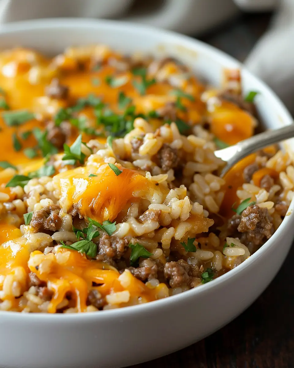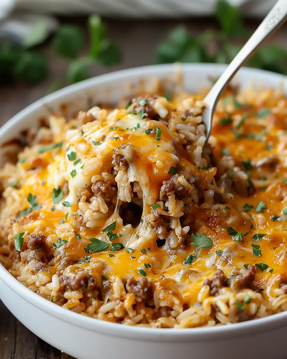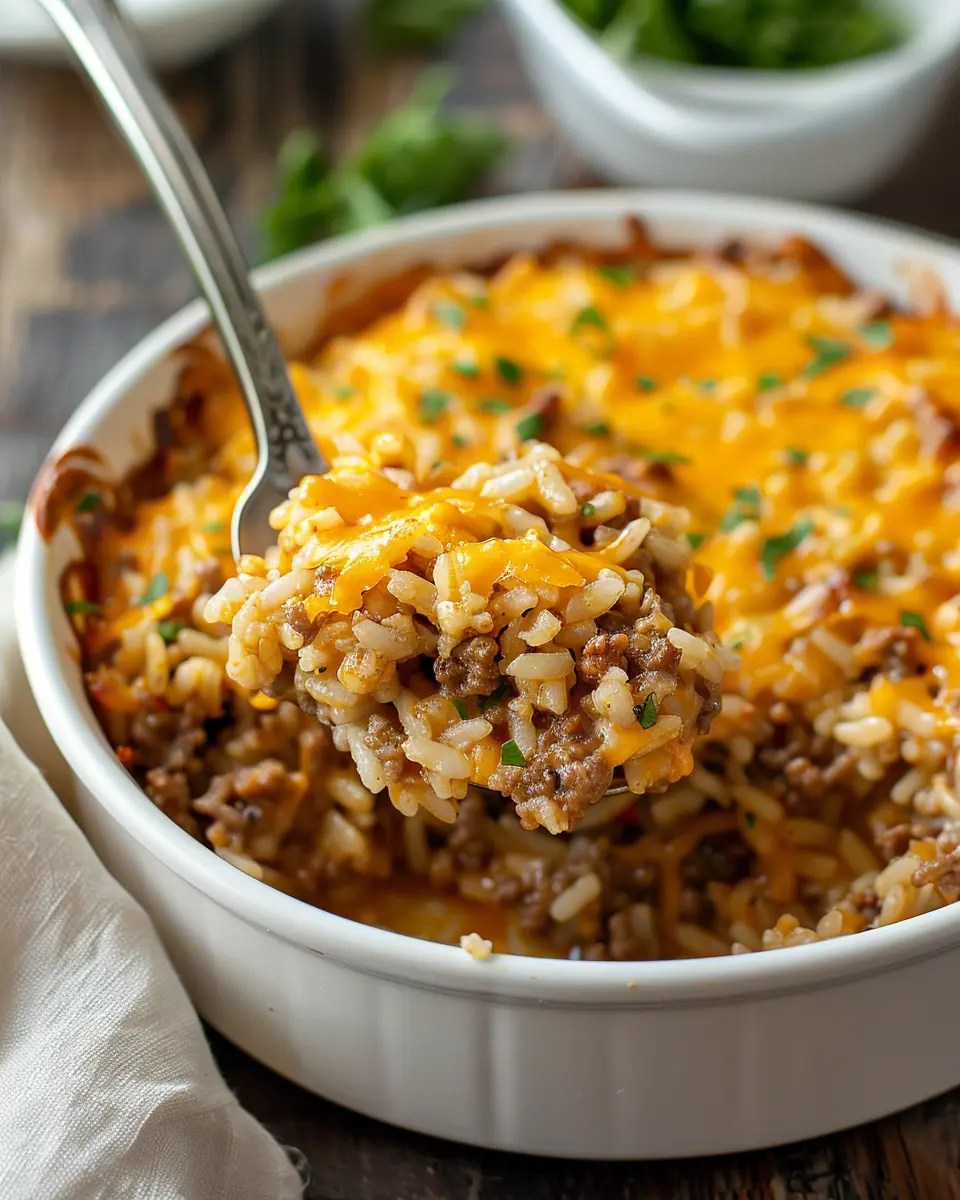 PrintCheesy Ground Beef and Rice Casserole Made Easy for Cozy Nights