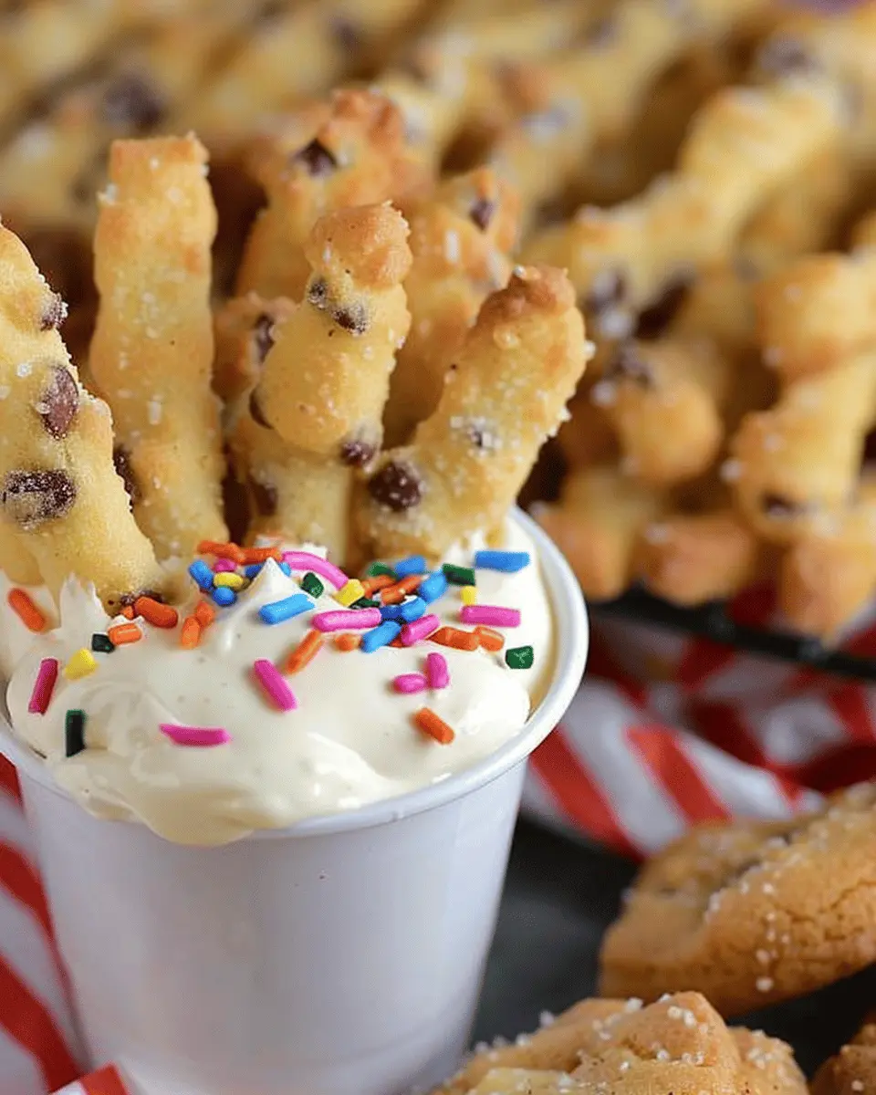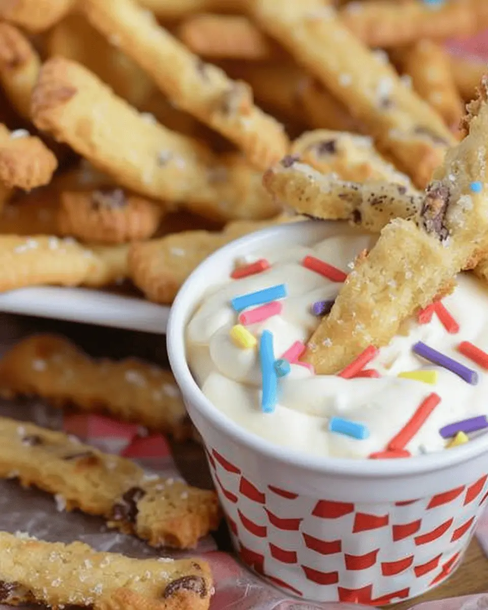 Cookie Fries with Frosting Dip are the perfect indulgent treat, combining the fun shape of fries with the sweetness of cookie dough and frosting.