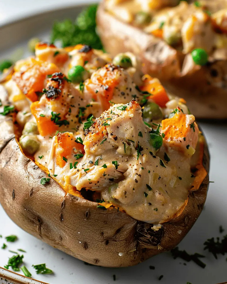 PrintCreamy High-Protein Chicken Pot Pie Stuffed Sweet Potatoes Delight