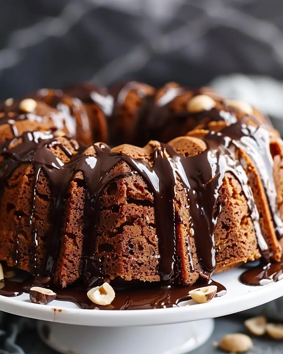 Enjoy the rich flavors of hazelnut and espresso in this delectable bundt cake topped with a luscious chocolate glaze.