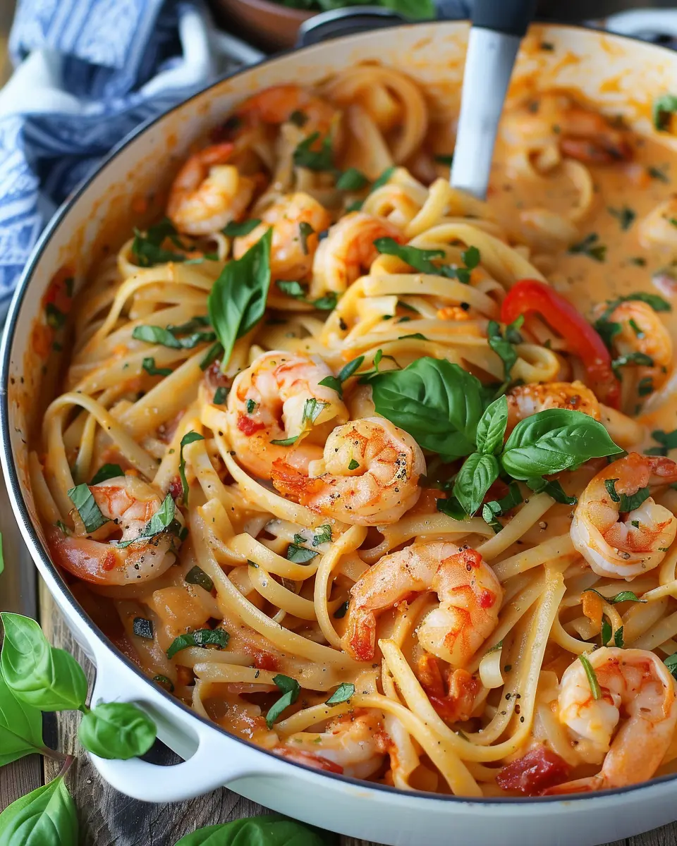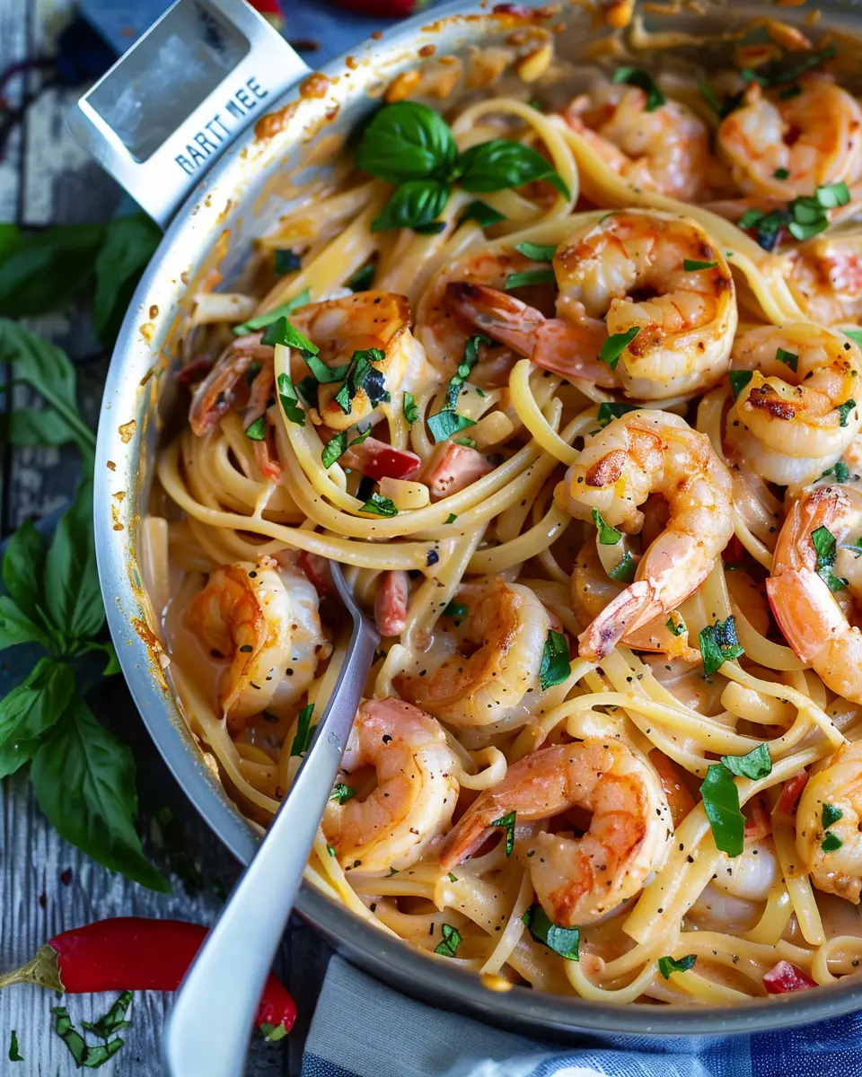 A delicious and romantic dish that combines succulent shrimp with pasta in a creamy sauce.