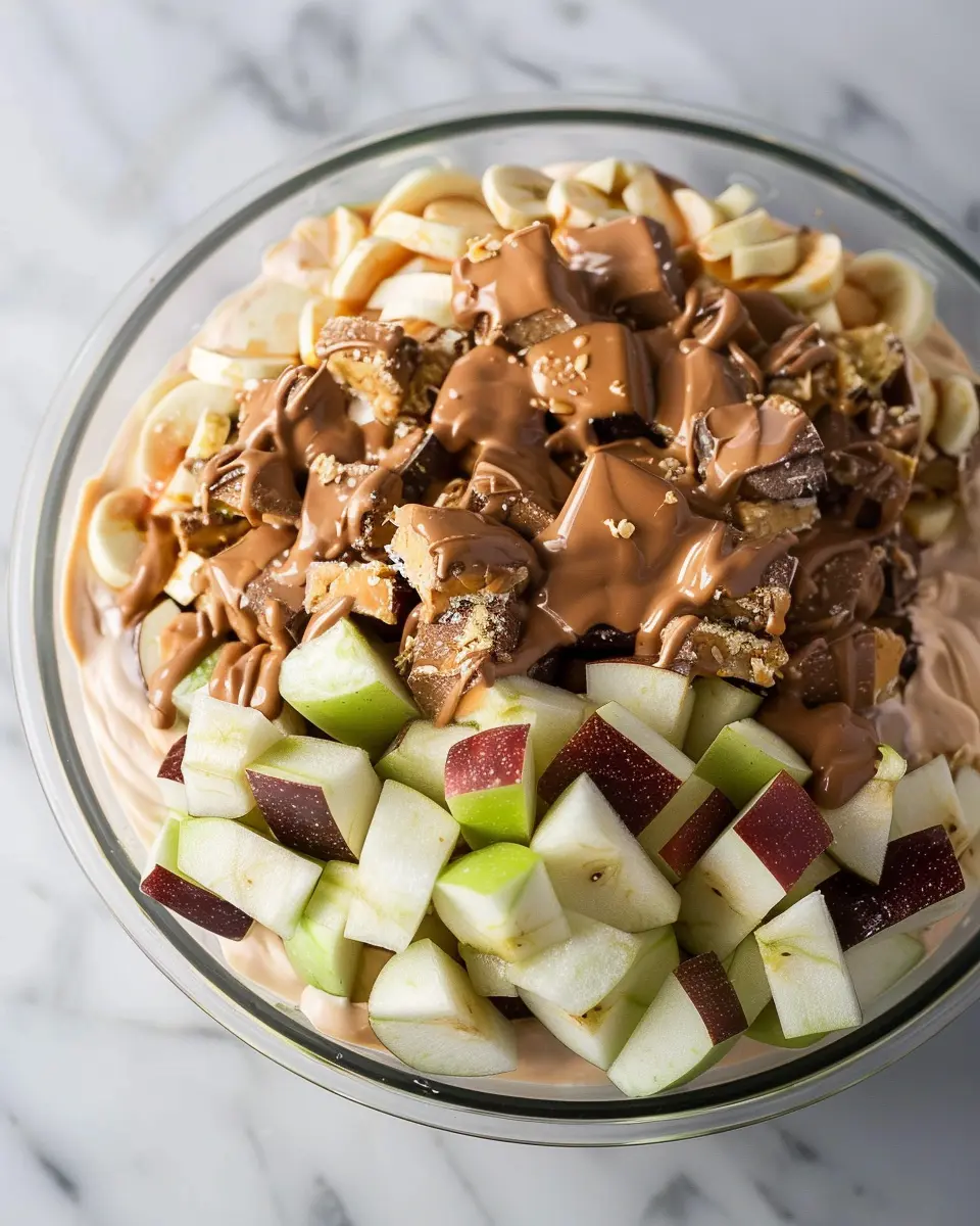 Chop Wisely: Cut your apples, Snickers bars, and other ingredients into bite-sized pieces. This not only enhances the presentation but also makes every spoonful a delicious mix.