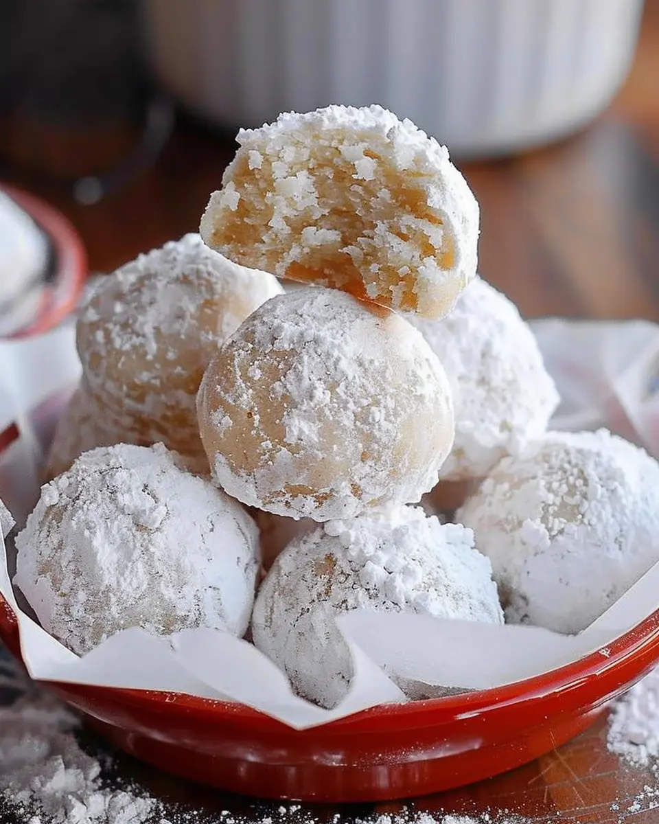 Once out of the oven, let the cookies cool on the baking sheet for about 5 minutes. This is the perfect time to prepare a bowl of powdered sugar. After the cookies have cooled slightly, roll each in the sugar until they’re completely coated. This not only gives the cookies their signature look but also enhances their sweetness.